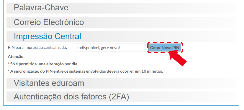 2 - Se já tem um pin de impressão ativo: aceda a Painel de Controlo e verifique se no menu "Impressão Central" se já tem um pin gerado (este vai servir para se autenticar na impressora). Se lhe aparecer a mensagem "Indisponível, gere novo!" carregue no botão "Gerar Novo PIN"
